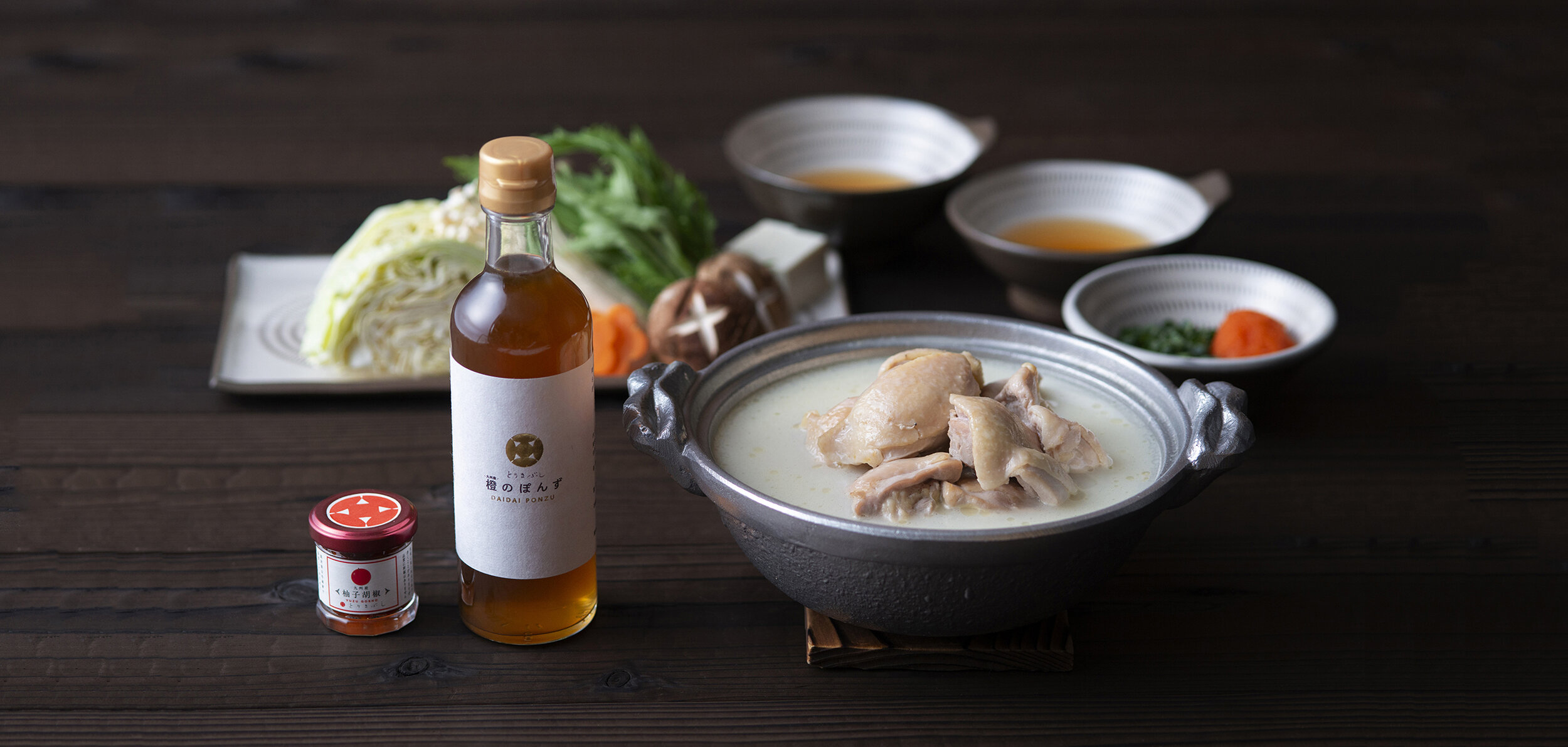 橙の果汁を使用した、まろやかで上品な甘さのぽん酢です。お酢の酸味が苦手な方や小さなお子様にも喜んでいただける優しい口当たりが魅力。当店の水炊きでご賞味いただくぽん酢をベースに、福岡県大川市で300年の歴史を誇る庄分酢様と共同開発いたしました。茹でた野菜や豚肉などにさっとかけるだけで、和食店の味わいに。サラダのドレッシングとしてもお使いいただけます。